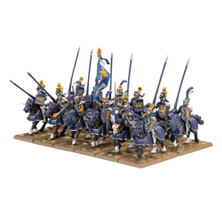 Ce kit en plastique permet d’assembler 12 Chevaliers de l’Empire, pour les utiliser dans votre armée de l’Empire de l’Homme à Warhammer: The Old World. Chaque Chevalier monté peut être doté d’une arme de base ou d’une lance de joute. Deux d’entre eux peuvent être assemblés comme des champions, deux autres comme des porte-étendards, et deux autres comme des musiciens, ce qui signifie que vous pouvez les séparer en deux unités de 6, avec chacune son propre état-major optionnel, ou les aligner comme une seule grosse unité de 12. Vous trouverez aussi des options de têtes et, selon la façon dont vous assemblerez et peindrez vos figurines, elles pourront représenter différents Ordres de Chevalerie de l’Empire, tels les Chevaliers Panthères et les Chevaliers du Loup Blanc.