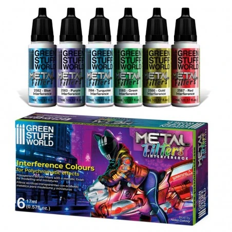 Filtres acryliques transparents avec une finition métallique qui permettent de modifier et métalliser la couleur qu’ils recouvrent. Appliquer par-dessus d’autres couleurs plates, métalliques ou de couleurs changeantes. Mélangés ensemble ou appliqués successivement, ils créent de nouvelles combinaisons. Finition métallique brillante. Valable pour pinceau ou aérographe.