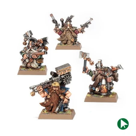 Ce kit en métal permet d’assembler quatre Ingénieurs Nains, des personnages ingénieux des Forteresses Naines dans Warhammer: The Old World.