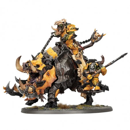 Ce kit plastique permet d’assembler un Kroboss sur Gueule-ki-grogn’, un chef Mâchefer intrépide chevauchant une monstruosité porcine.