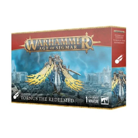 Ce kit en plastique à emboîter permet d’assembler Tornus l’Affranchi, un puissant héros pour les armées d’Éternels de l’Orage dans Warhammer Age of Sigmar. Son âme désormais rachetée, le guerrier jadis connu sous le nom de Torglug le Honni est désormais un héraut volant de Sigmar, assigné aux chambres de la Perdition. Il vole sur des ailes de lumière ressemblant à des plumes en lambeaux, et son armure ainsi que sa peau sont frappées de l’iconographie des chambres de la Perdition. Il est armé d’une redoutable grande lance sanctifiée. Ce kit permet autrement d’assembler un Chevalier-Azyros standard, équipé d’une arme astrobénite.