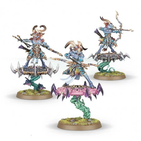 Ce kit plastique contient les composants nécessaires pour assembler 3 Tzaangor Enlightened, armés de lances de Tzeentch. Chaque figurine peut être assemblée à pied, ou montée sur un des 3 Discs of Tzeentch inclus – ces derniers sont hérissés de pointes et de dents pour déchiqueter leurs malheureux adversaires, et une volute de magie les relie à leur socle. Une des figurines peut être assemblée en tant qu’Aviarch, muni de son propre pectoral, de deux coiffures au choix et d’une arme plus élaborée pour témoigner de son rang. 6 têtes différentes sont proposées afin de varier vos figurines.